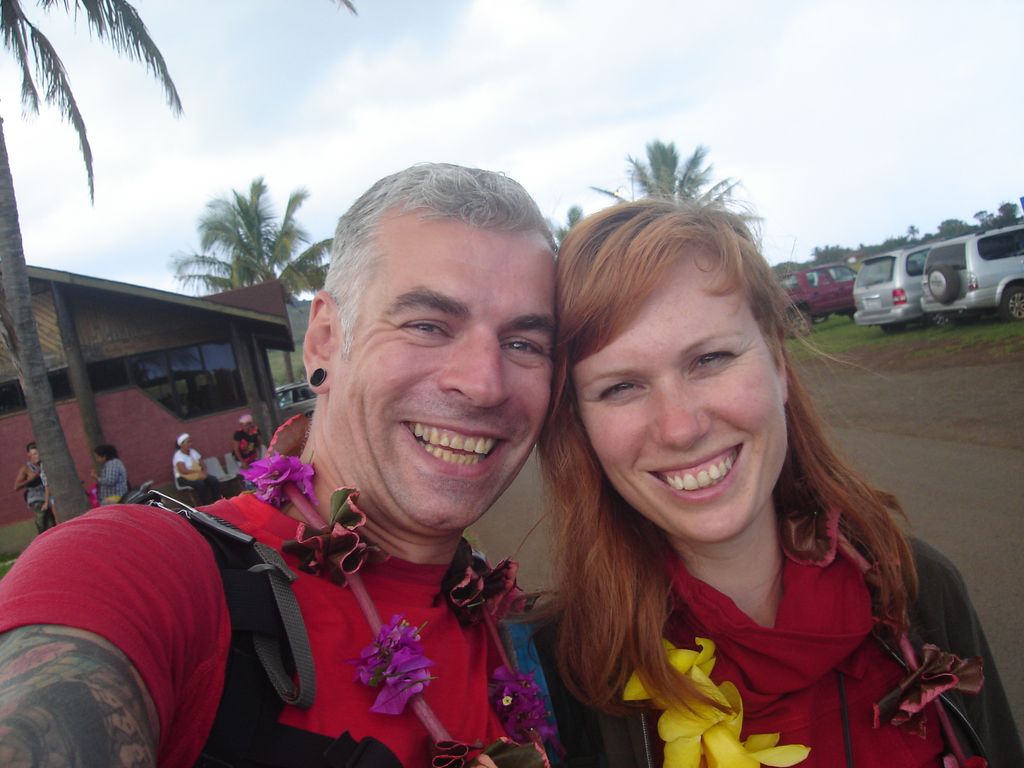 Encore une fois, il faut se lever tôt pour aller prendre l’avion (que c’est dur la vie de voyageurs!). Nous arrivons 5h plus tard à l’aéroport de Rapa Nui. La piste va d’un côté à l’autre d’une des pointes de l’île et c’est assez impressionnant comme atterrissage ! Nous sommes accueilli chaleureusement par Juan et sa femme, avec les traditionnels colliers de fleur.