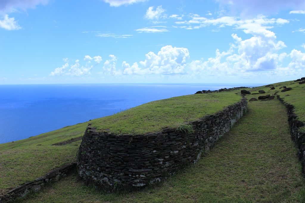 Nous avons enchaîné par la visite du site d’Orongo. Un village utilisé uniquement une fois dans l’année pour célébrer le Maké-Maké et le rituel du Tangata roa. Un rituel en forme de compétition pour désigner un champion parmi les chefs des tribus afin de devenir l’incarnation de l’homme-oiseau. Un titre hautement honorifique car il sera chargé d’arbitrer les disputes entre les clans. Bon pas trop de chance pour lui car, à ce qu’il parait, il passait l’année suivante à l’écart des autres tribus et devait vivre seul dans une maison en ardoise, où seuls les prêtres avaient le droit de venir le voir et lui apportaient sa nourriture.