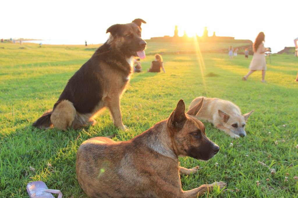 Le soir nous profiterons du scooter pour retourner prendre un apéro digne de ce nom face aux Moaïs, accompagnés de charmants canidés: