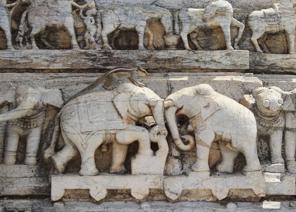 Après nous prendrons le temps de visiter le temple Jagdish, à quelques pas du palais. C’est un temple indo-aryen somptueusement sculpté qui renferme une statue de pierre noire de Vishnu. Chose amusante, il y a plein d’écureuils qui grimpent partout dans les anfractuosités du temple, Delphine et moi ne nous lassons pas de leurs facéties.